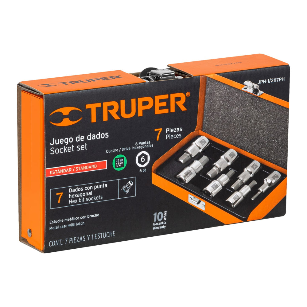 Juego de 7 dados cuadro 1/2" punta hex std, estuche metálico - Código: 13929